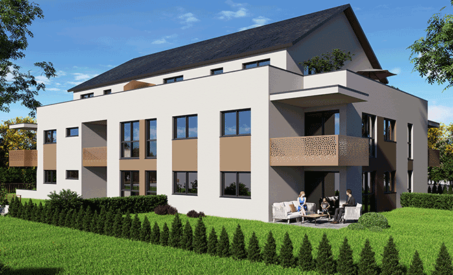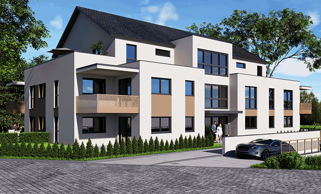 Das gute Gefühl, zu Hause zu sein, fängt bei unserem 12-Familienhaus bereits mit der Gestaltung im Außenbereich mir der Zufahrt in die Tiefgarage und barrierefreien Zugang zum Hauseingang an.